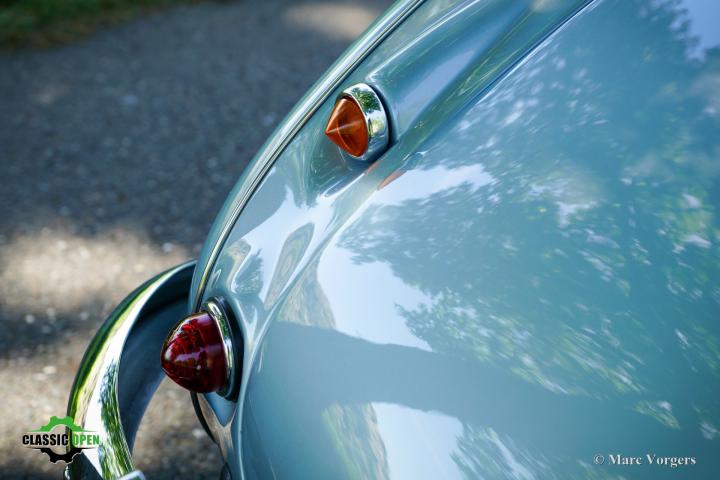 Exterieurkleur: ijsblauw metallic gecombineerd met een donkerblauw lederen interieur met witte biezen en donkerblauw tapijt. Zwarte soft-top en aluminium zijruitframes.