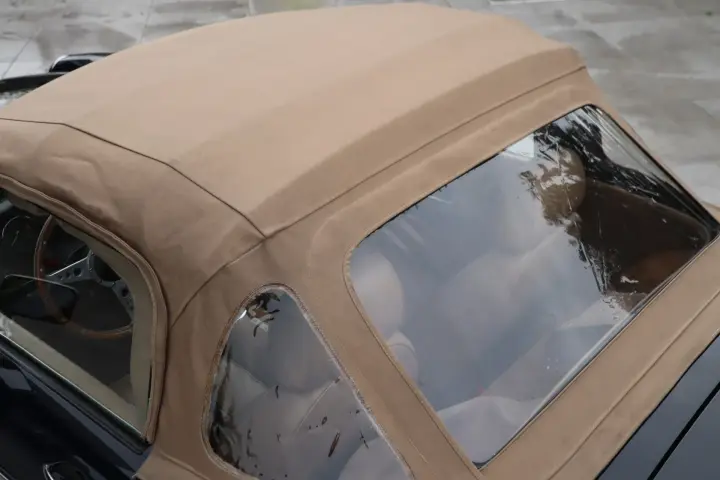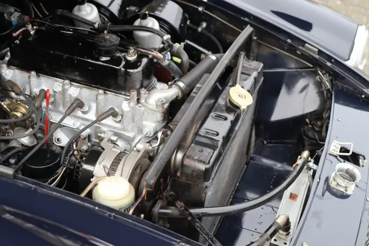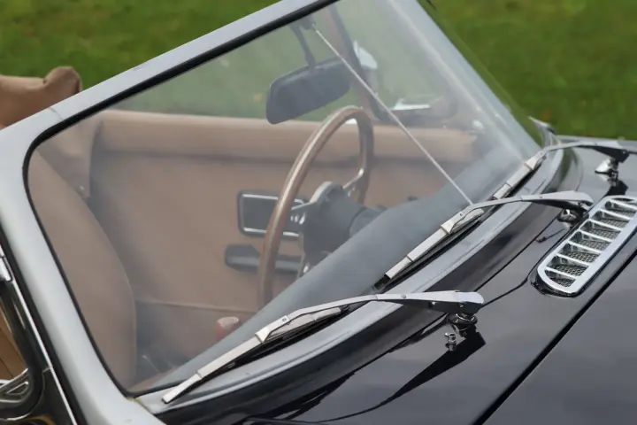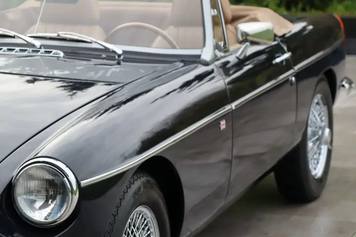 The car has been restored in the past, with the paintwork being sprayed neatly. The bodywork is very neat and free of rust and damage. The paintwork is eye-catching and strikingly fresh. In November 2025, the car was professionally polished, making it shine like never before. The “Union Jack” emblems adorn the side. The rubbers and lighting are also in good condition. The wire wheels have good tyres. The original chrome bumpers are free of significant damage. The chrome work is in very good condition. The windows are tinted. The soft top is also in good condition with no tears or damage, and the fastenings work well.