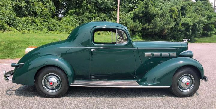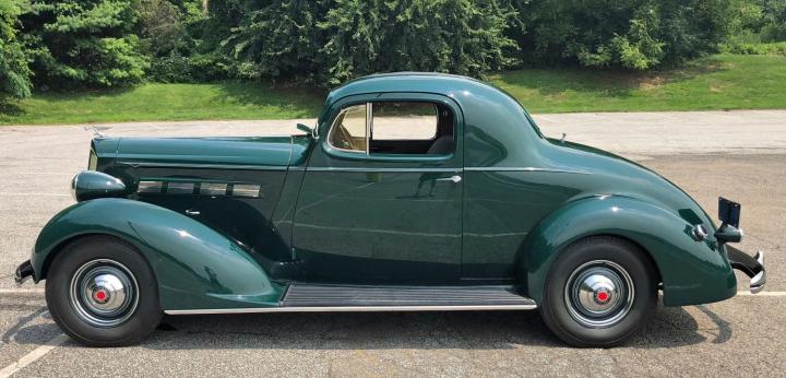1937 Packard Sport Coupe, with rumble seat, beautifully restored, completely rust free, gorgeous Coachman Green paint, immaculate Gray broadcloth interior with amazing wood-graining, Gray leather rumble seat, brilliant chrome and trim, smooth and powerful 282 cu in 120 HP Straight 8 engine, 3-speed transmission, porcelain manifolds, deluxe heater, new radial tires, fully serviced and ready to drive, rare and stunning!