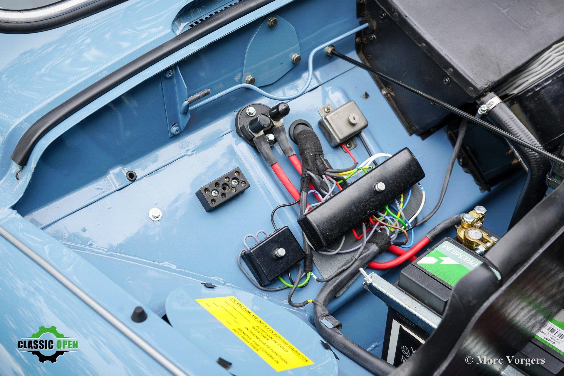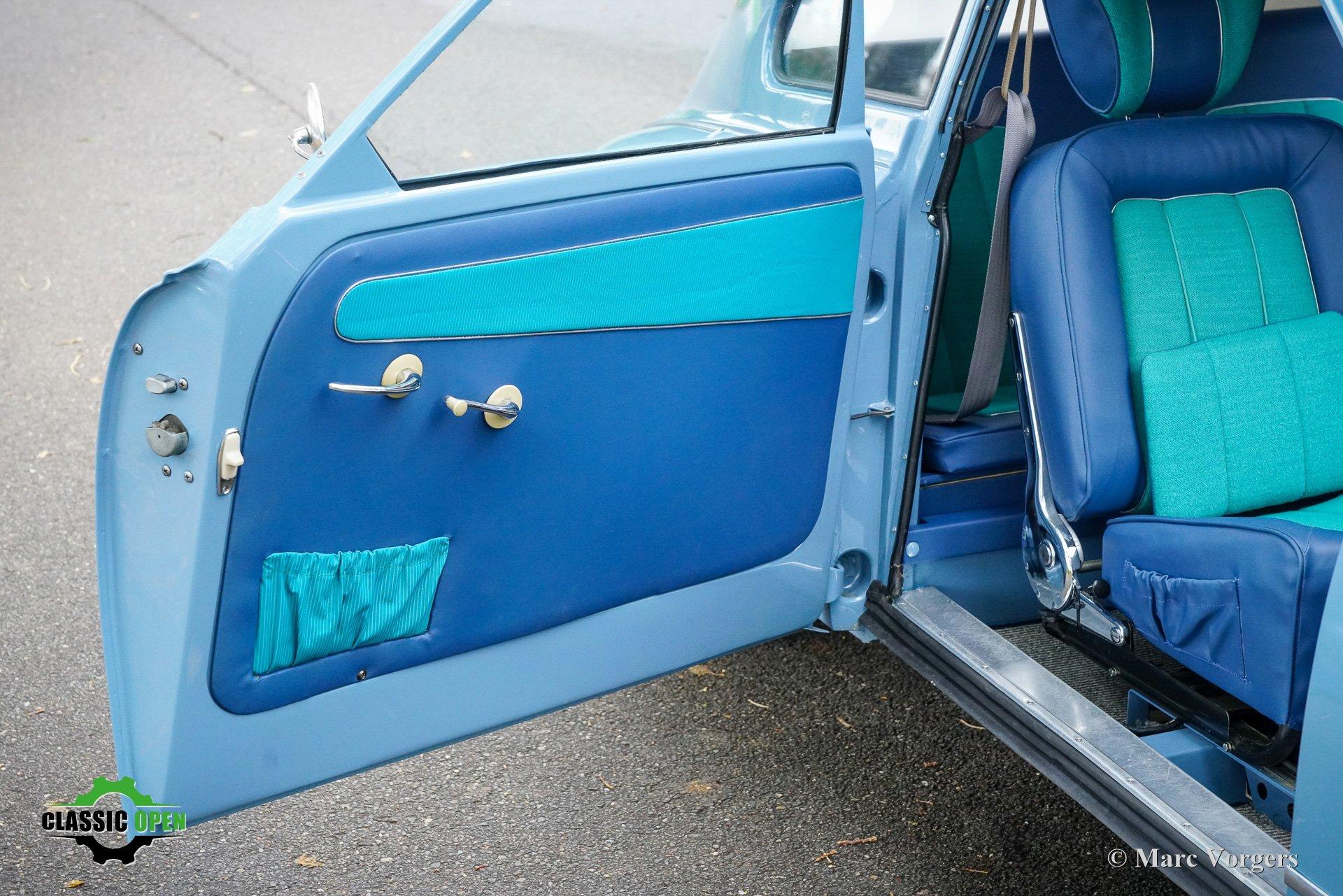 Carrosserie in blauw gecombineerd met een blauwgroen vinyl/stoffen interieur afgewerkt met zilveren biezen.