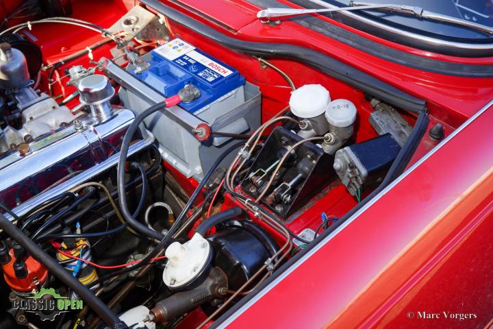 Het stoffen dakdeel met inklapbaar frame kan zeer compact in de kofferbak worden opgeborgen. Deze Triumph TR 4 is in het verleden gerestaureerd en de auto verkeert in een zeer goede tot excellente staat.