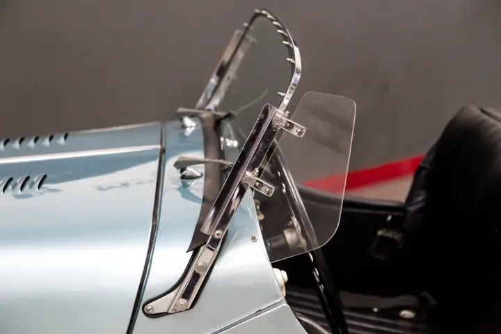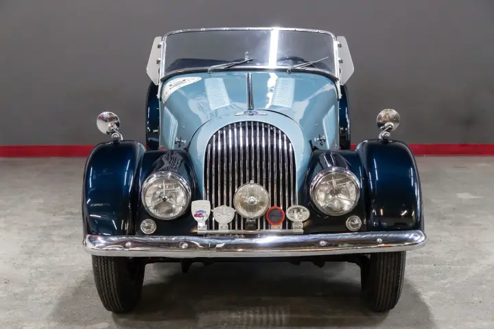 Powered by a replacement 1,991cc inline-four paired with a four-speed manual transmission, the car is finished in two-tone blue over black leather. Equipment includes a black soft top, a tonneau cover, 16″ steel wheels, hubcaps, dual spare wheels and tires, dual SU carburetors, louvered hood panels, a wood dashboard, a Bluemels Brooklands steering wheel, and seatbelts. The car comes with the Morgan Motor Company Chassis Record and a tool kit.