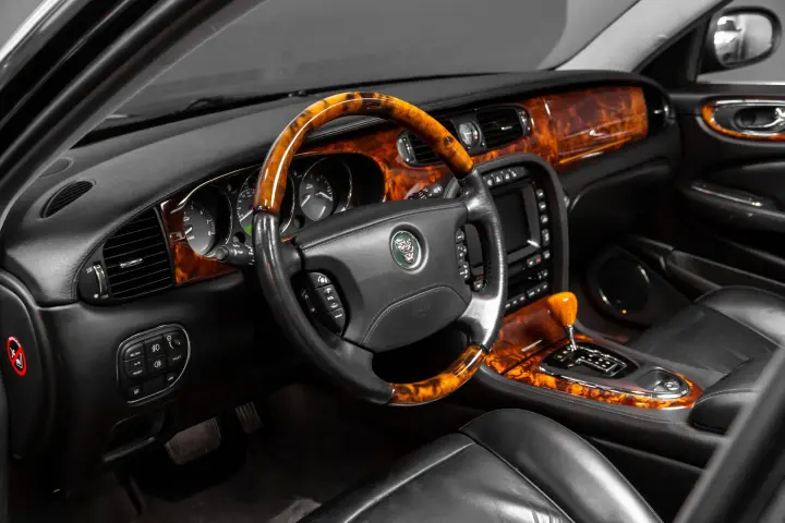Now we move to topside of this well preserved Black on Black Vanden Plas example. The paint still looks like it did when pulled from the showroom in 2006 ! The interior wood trim is perfect ,the leather is soft and supple with no scuffs or scratches. The car is a non smoker car so it retains that wonderful Jaguar new car aroma.