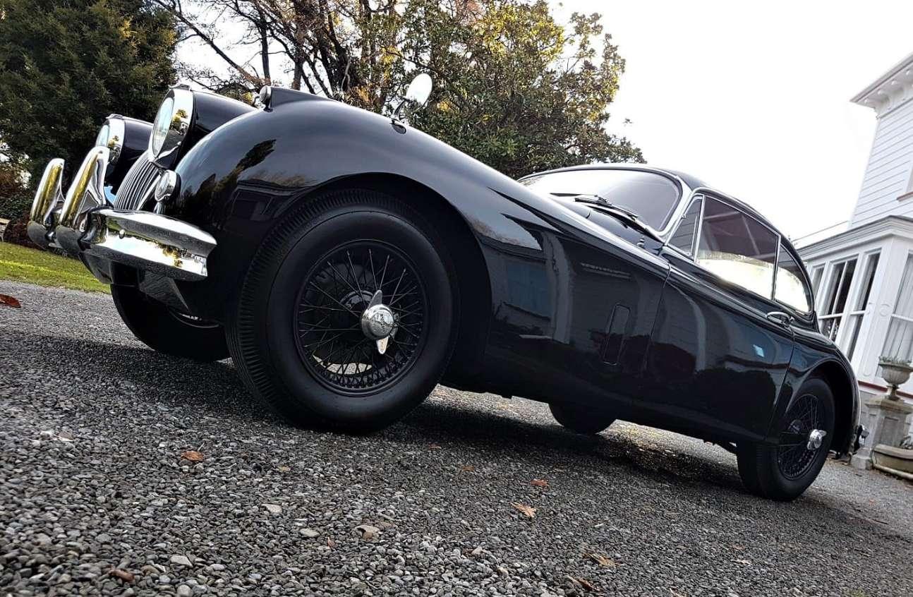 This XK 150 is equipped with five factory knock-off wire wheels, including the spare, and rides on period-correct Coker Classic blackwall bias tires.