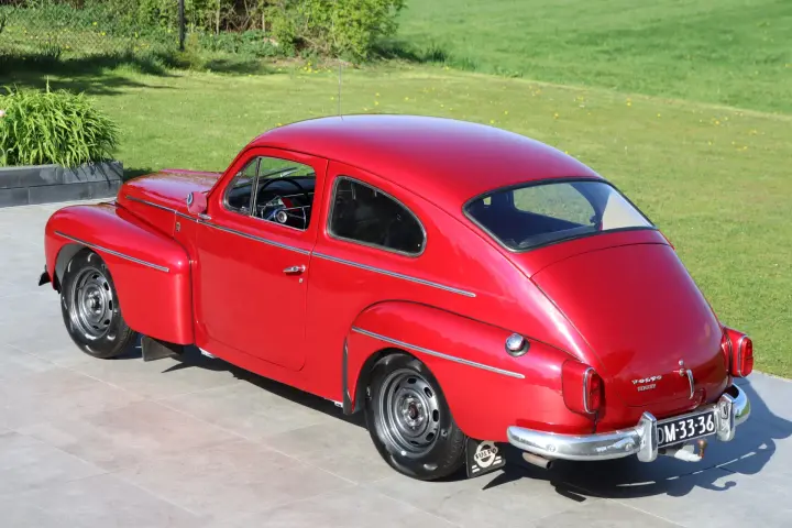 Choosing the colour proved a challenge, as the original 1965 Volvo red (colour code 46) was not the preferred option. After a long search, a sparkling pearlescent metallic red from Alfa Romeo was chosen: ‘Rosso Competizione’. The colour combines beautifully with dark anthracite-painted alloy wheels, creating a unique and sporty appearance. The restoration was carried out with the principle of reusing parts wherever possible. Surprisingly, much of the car was in good condition, meaning many original elements, such as the chrome trim, are still present. The paintwork, windows and lighting are in good condition. The gaps between panels fit together neatly, indicating a damage-free history. A tow bar has been fitted at the rear. The exterior of the Volvo PV 544 is characterised by its timeless, rounded shapes and distinctive lines. The car has a robust yet charming appearance with its bulging mudguards, narrow grille and striking front end. The compact build and classic proportions give the PV 544 a sporty and distinctive character. The car comes with spare hubcaps and the original trim strips.