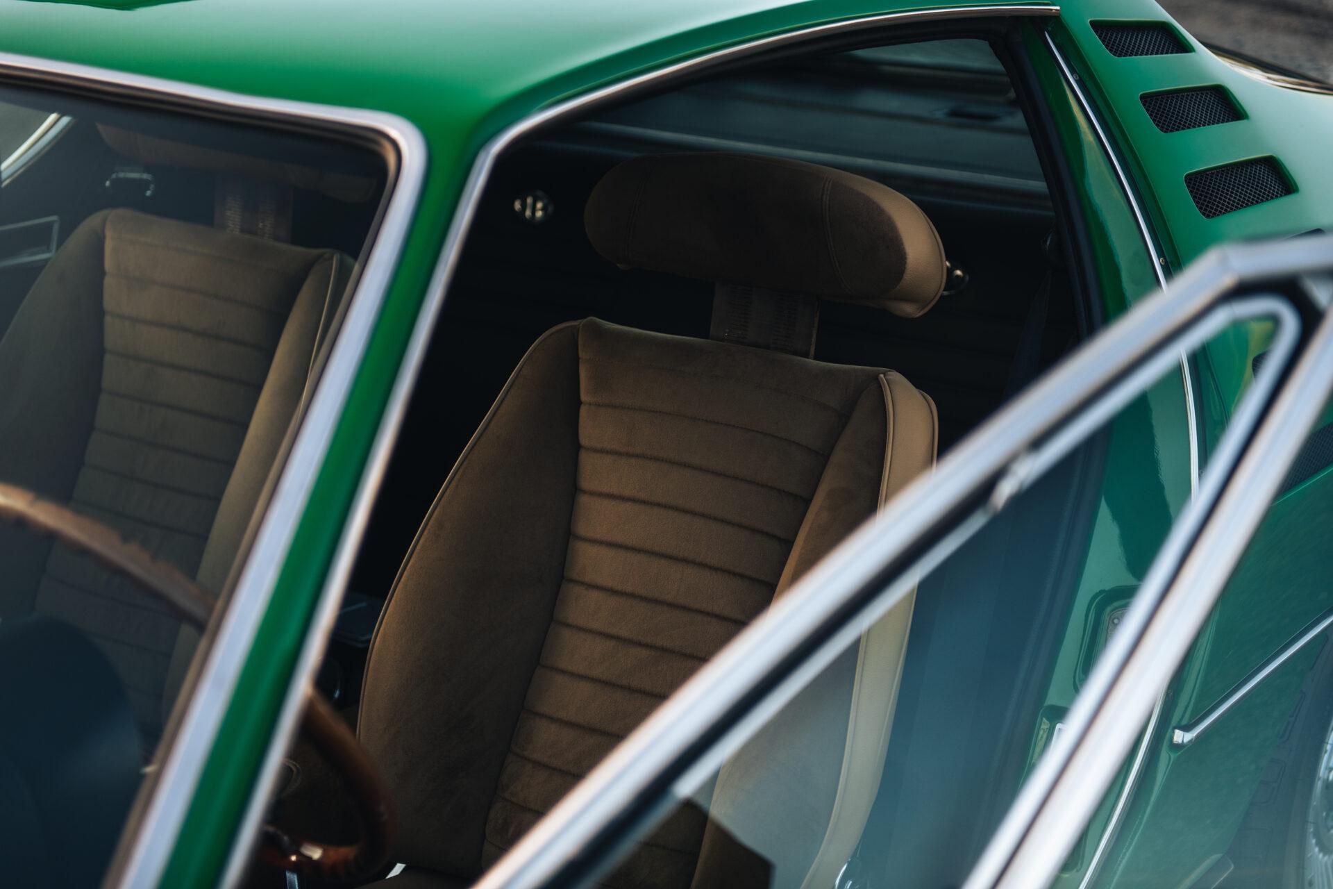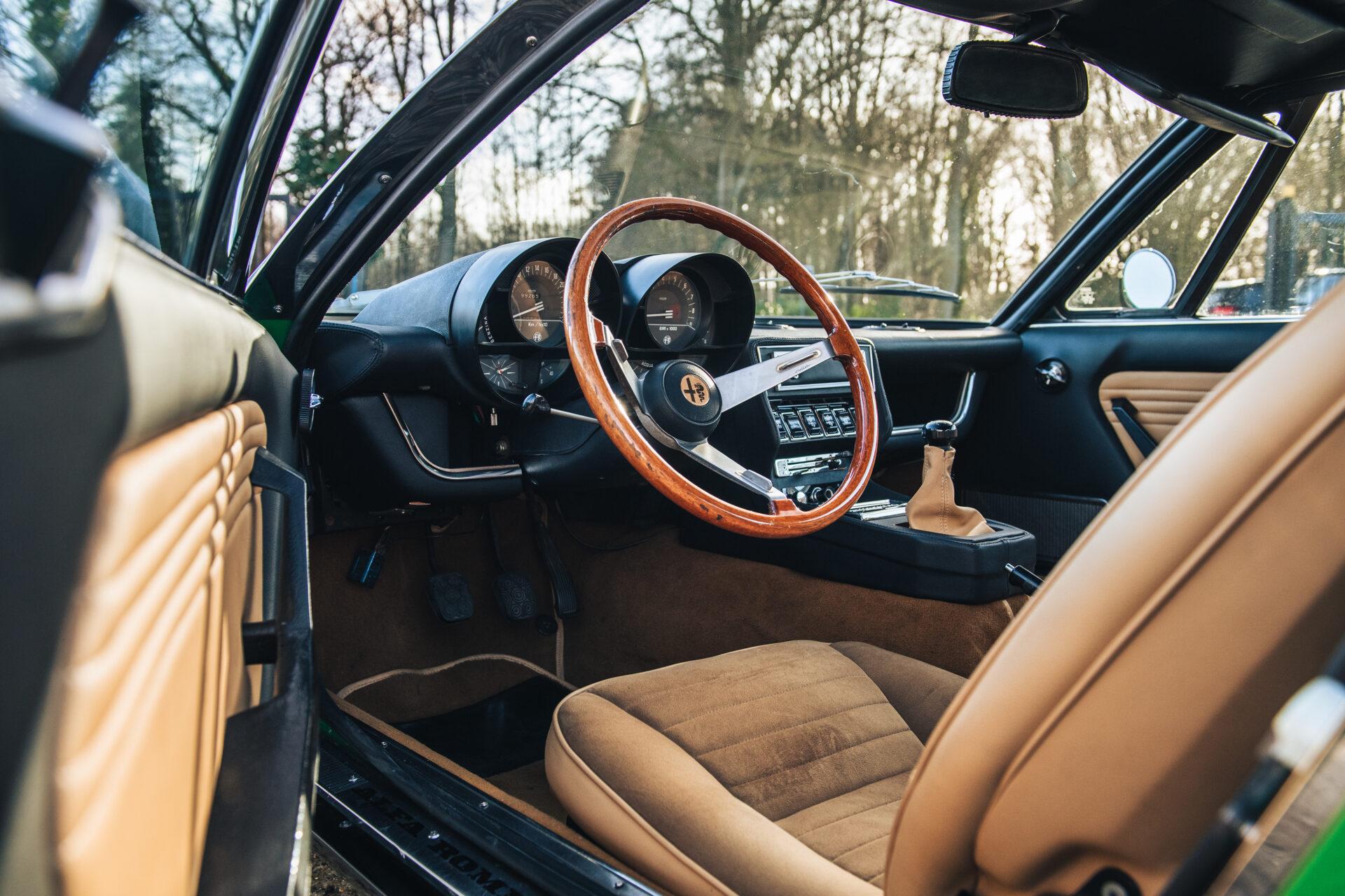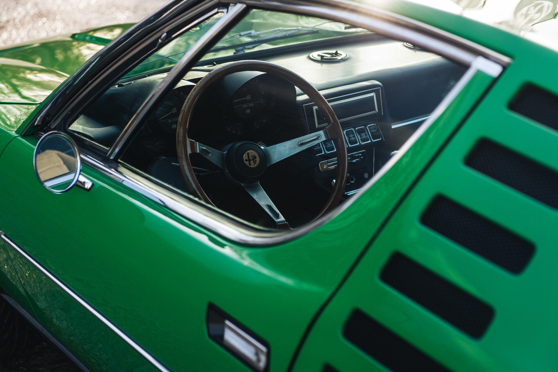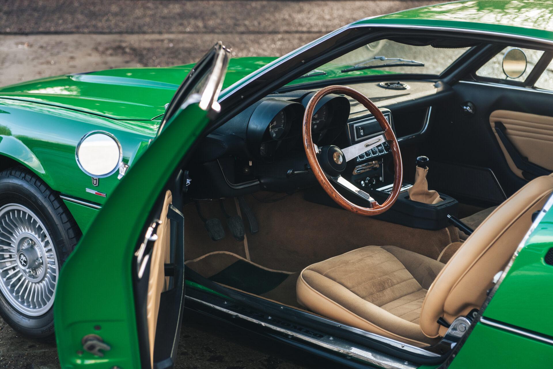 Our 1972 Alfa Romeo Montreal has undergone an extensive nuts and bolts restoration. Every part of the car has been carefully dismantled, inspected, cleaned and repaired or replaced where necessary. The result is a car that is in absolute top condition and looks and drives just as it did when it first rolled off the production line. The Verde Medio body colour has been expertly reapplied according to the rules of art. This has resulted in a beautiful, glossy finish that really shows off the lines and shapes of this iconic Italian sports car. The bright green combines perfectly with the pale interior to create a harmonious whole.