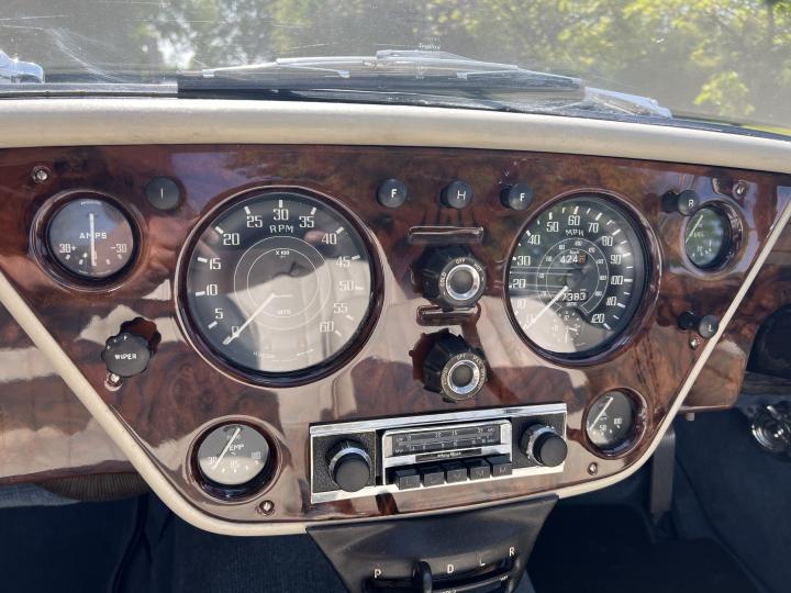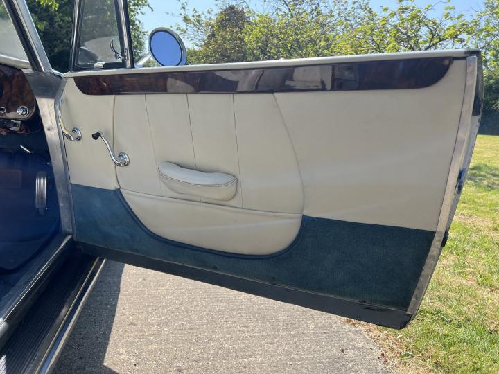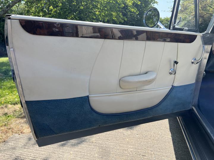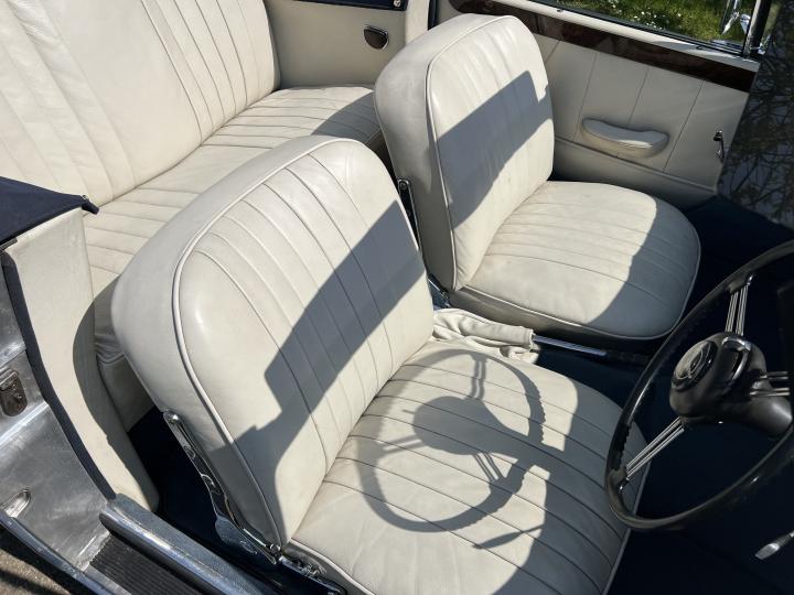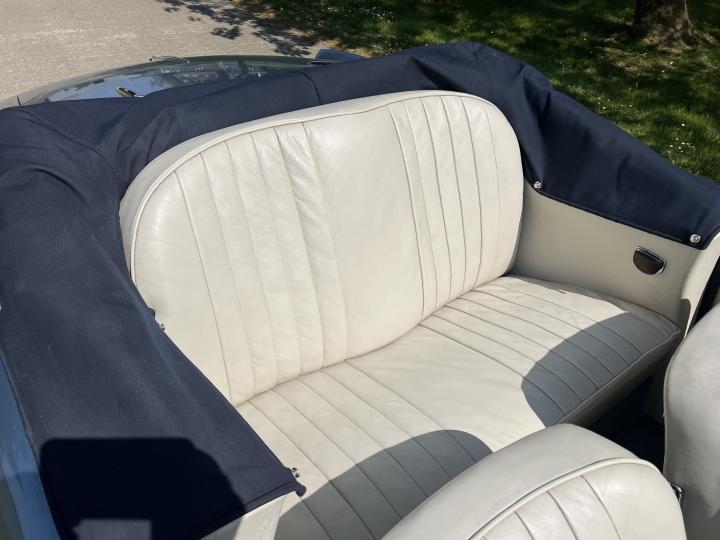 During the restoration both Engine and gearbox were rebuilt, carbs rebuilt tuned and balanced. The body was restored, repainted in its original colour of Alice Blue, new carpets fitted throughout, a new mohair hood complete with west of England cloth headlining was installed and catches re-chromed. The brakes were overhauled by Red Triangle Garage with new Coopercraft four pot front callipers and discs.