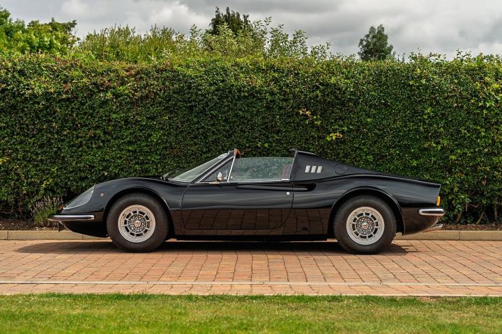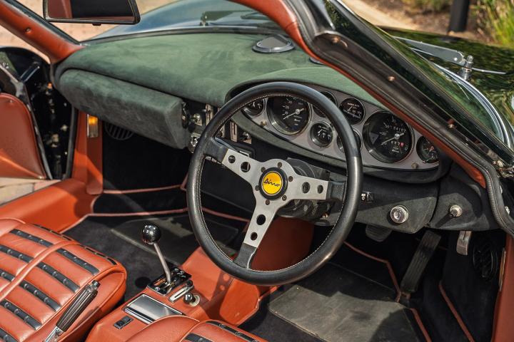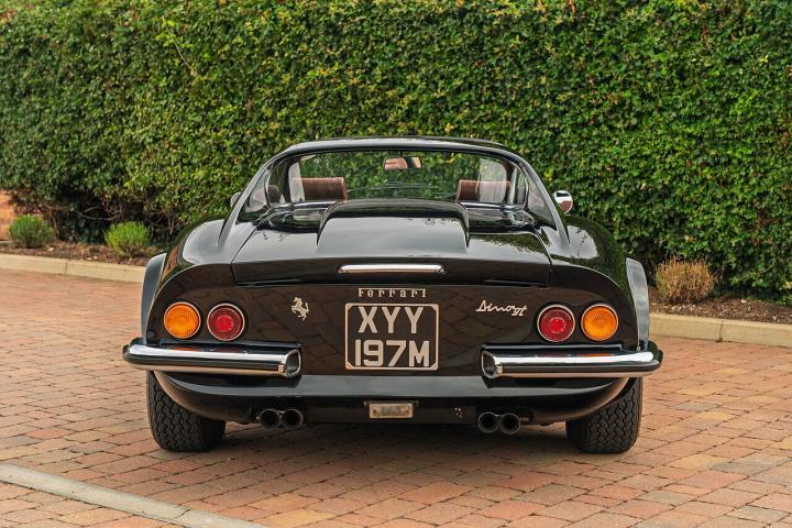 Chassis no. 06926 was imported via Maranello Concessionaires in August 1973 and retailed via main dealer Guy Salmon Ltd. Its first private owner was renowned Ferrari collection and Pink Floyd drummer, Nick Mason. One of circa 21 right-hand drive models ordered with flared wheelarches and 7.5" wide Campagnolo wheels. The Dino was originally finished in Marrone Metallizato (106-M-73 Salchi) with beige (430) interior, and left the factory equipped with the optional electric windows. During the 1980’s the car was repainted in Nero and re-trimmed with brown hide/Daytona seat inserts.