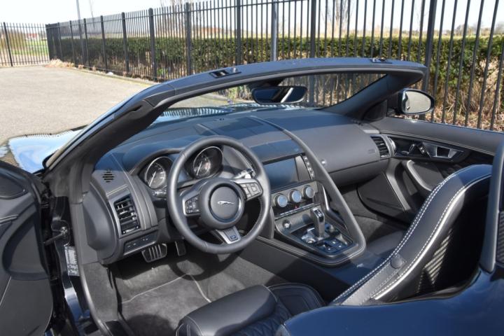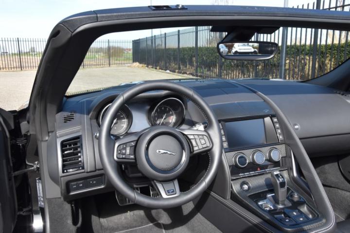 This is not just any F-Type! The original 5.0 liter V8 version already has a considerable amount of horsepower as standard, but in the Project 7 this was increased to 575 bhp. The roof was completely omitted and the windshield was lowered with 30 mm. Behind the driver, the distinctive “D-Type” hump was added and the front bumper, spoiler, diffuser and rims were modified. SVO developed a custom tuning for the 8-speed quickshift transmission and the electronic active diff, enabling acceleration from 0-60 mph in 3.9 seconds. The top speed is limited to 300 km/h . The aluminum body weighs 80 kg less than the standard F-Type and the tailgate, bonnet, louvres, power vents in the front wings and mirror caps are made of carbon.