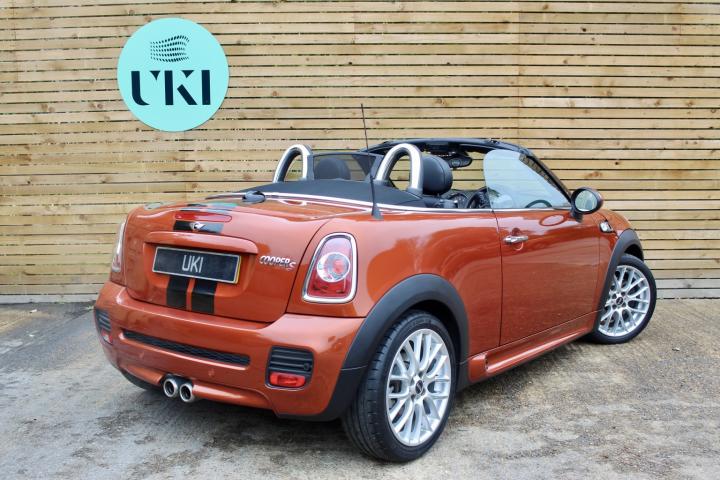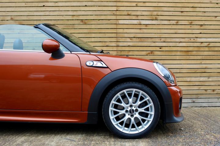 There are some great features on this Mini Roadster which includes - Spice Orange metallic paint, John Cooper Works bodykit, 17" John Cooper Works alloy wheels, Bi-Xenon headlights, Black headlight reflectors, Black sports stripes, Full black leather sports seats, Heated front seats, Front centre armrest, Wind deflector, Rear parking sensors, Gloss black interior trim, Chrome line interior, Harman Kardon audio, Ambient lighting, Cruise control, Automatic lights and wipers, Bluetooth telephone, DAB radio, USB/Aux input.