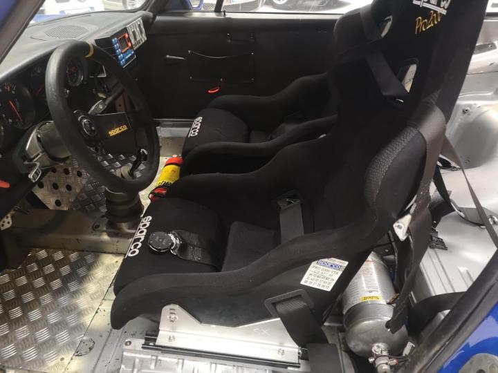 Racing seats and harnesses, homologated for competition use.