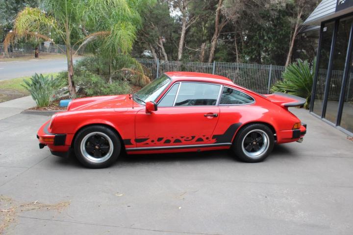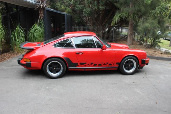 Maintaining its originality, this ’75 2.7 is finished in Guards Red, adorned with black ‘Carrera’ graphics, a prominent whale-tail rear spoiler, and classic Fuchs alloy wheels. Step inside to find a sleek black-trimmed interior, complemented by a sporty steering wheel and a Sony stereo/CD player.