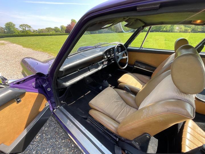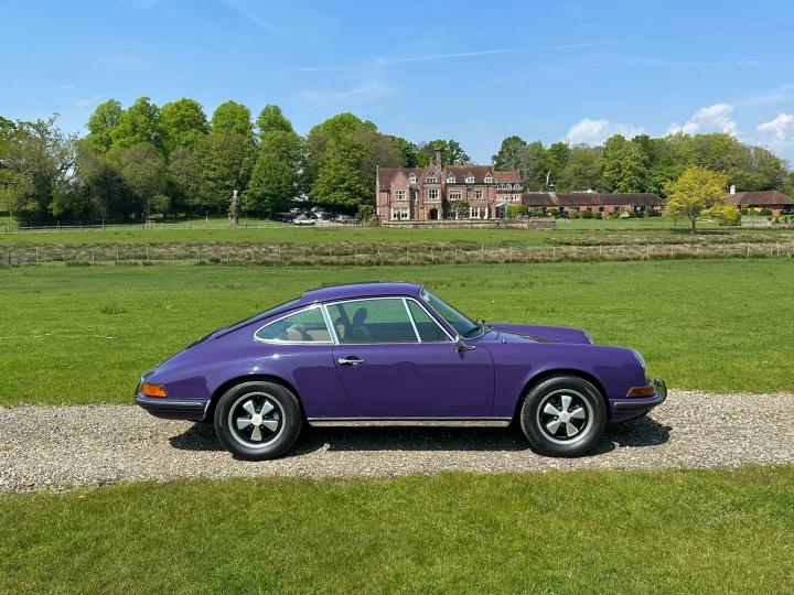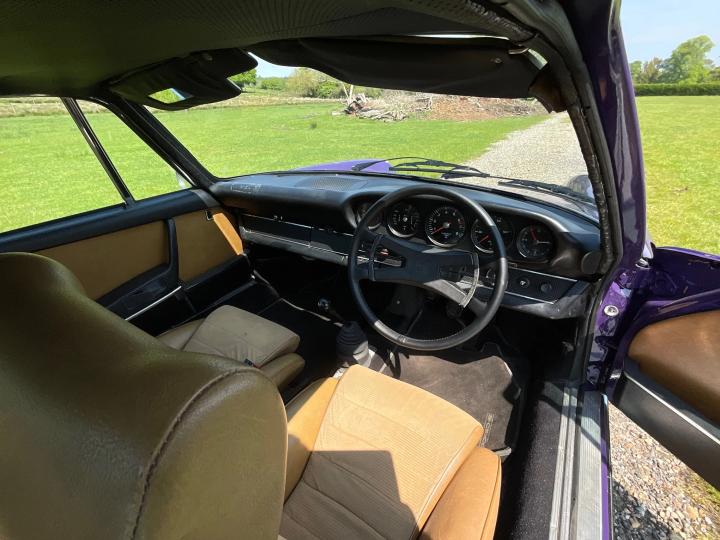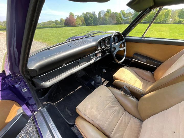 1973 Porsche 911 T 2.4. Showing 99,000 miles, this 911T has just come from long ownership having been in the previous owners hands for the last 26 years, with just 5 former keepers registered. This car is finished in 341 Royal Purple which is believed to be the original colour with original 15" Fuchs forged alloy wheels which are in the classic black backed colourway, tan and black interior and the classic 5 dial Porsche setup dashboard. It has lots of originality, including the original service book stamped from authorised Porsche dealer "Motortune Ltd" in Brompton, London, in 1975. It is believed that the car remained with a dealer before getting its first registration 2 years later. In 2019, the car underwent a bodywork restoration with a fresh respray and any welding needed was done. All the body panels align well and there is no visible distortion to any areas. Overall the bodywork is in good solid condition. The underside is stunning as shown in the images. In 2022, a major service was carried out including a new clutch, brakes refreshed all round, new calipers all round, the engine seals replaced alongside some of the oil lines as necessary. The carpets were replaced along with new front and rear windscreens. The mechanicals on this porsche are superb. The car drives great and no expense has been spared when it has come to servicing this car. There is a huge amount of history contains old tax discs, original service book, old MOTs, reciepts, photographs from the restoration and more. This 911 will always put a smile on your face once you’re behind the wheel, and it will always turn heads.