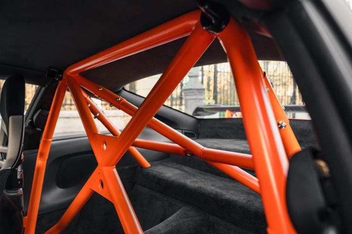 The exclusivity of the 997 GT3 RS is based on intensive weight reduction and specific distinctive elements. It adopts a wider chassis for better stability and also benefits from lightweight materials, including a carbon bonnet and spoiler, as well as a polycarbonate rear window. Its iconic Orange colour with black stripes or vice versa, as well as its lightweight forged alloy wheels, reinforce its aggressive look. Inside, the atmosphere is resolutely sporty with bucket seats, a partial roll cage and optional harnesses.