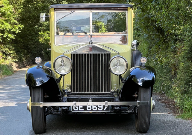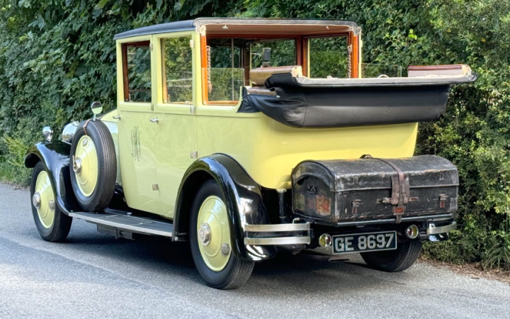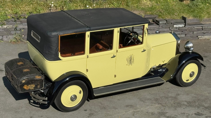 A delightful, early 20/25 with traditional, tall, upright coachwork, very stately, but fresh and cheerful in very nicely carried out primrose paintwork with tan leather interior, attractive veneers, and excellent headlining and carpets. In fact, the car is very fresh and clean throughout, inside and out. The car has some appealing vintage features, such as two-way divided windscreen, a 'porthole' communication window to the division, a lovely set of instruments, P80 'bullseye' headlights, 'Windover patent' slimline bumper front and twin bladed quarter bumpers at the rear, a full set of wheel discs (also Windover's own) and a very 'characterful' trunk on the rear. We have just completed an engine overhaul, which included new main and big end bearings, new pistons and little ends, timing case bearings, etc, and a clutch overhaul while we were at it, giving the car new lease of life. Correct, attractive and smart, offered newly MoT tested. The last owner very effectively turned the car into a 'Darling Buds of May lookalike', and we have included a Lledo model of it to complement this, as you will see in the photos.