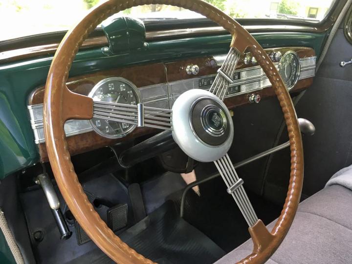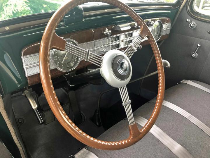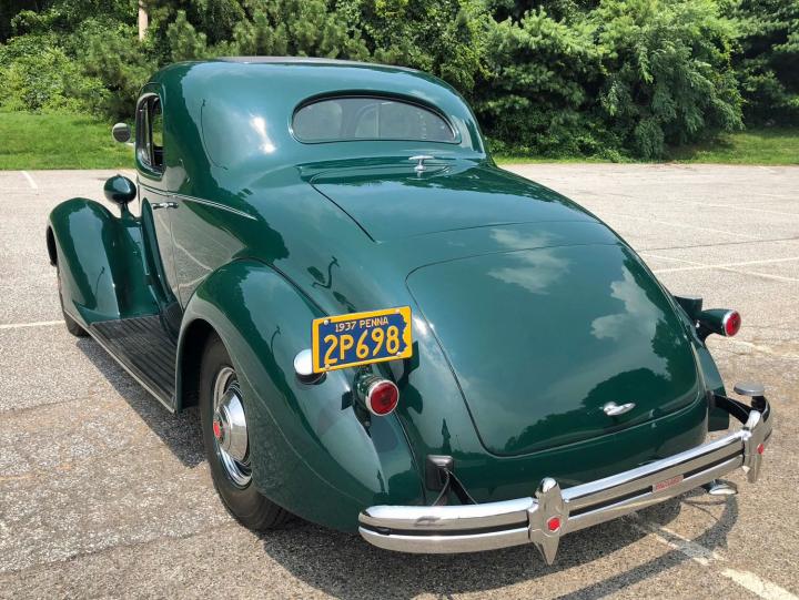 1937 Packard Sport Coupe, with rumble seat, beautifully restored, completely rust free, gorgeous Coachman Green paint, immaculate Gray broadcloth interior with amazing wood-graining, Gray leather rumble seat, brilliant chrome and trim, smooth and powerful 282 cu in 120 HP Straight 8 engine, 3-speed transmission, porcelain manifolds, deluxe heater, new radial tires, fully serviced and ready to drive, rare and stunning!