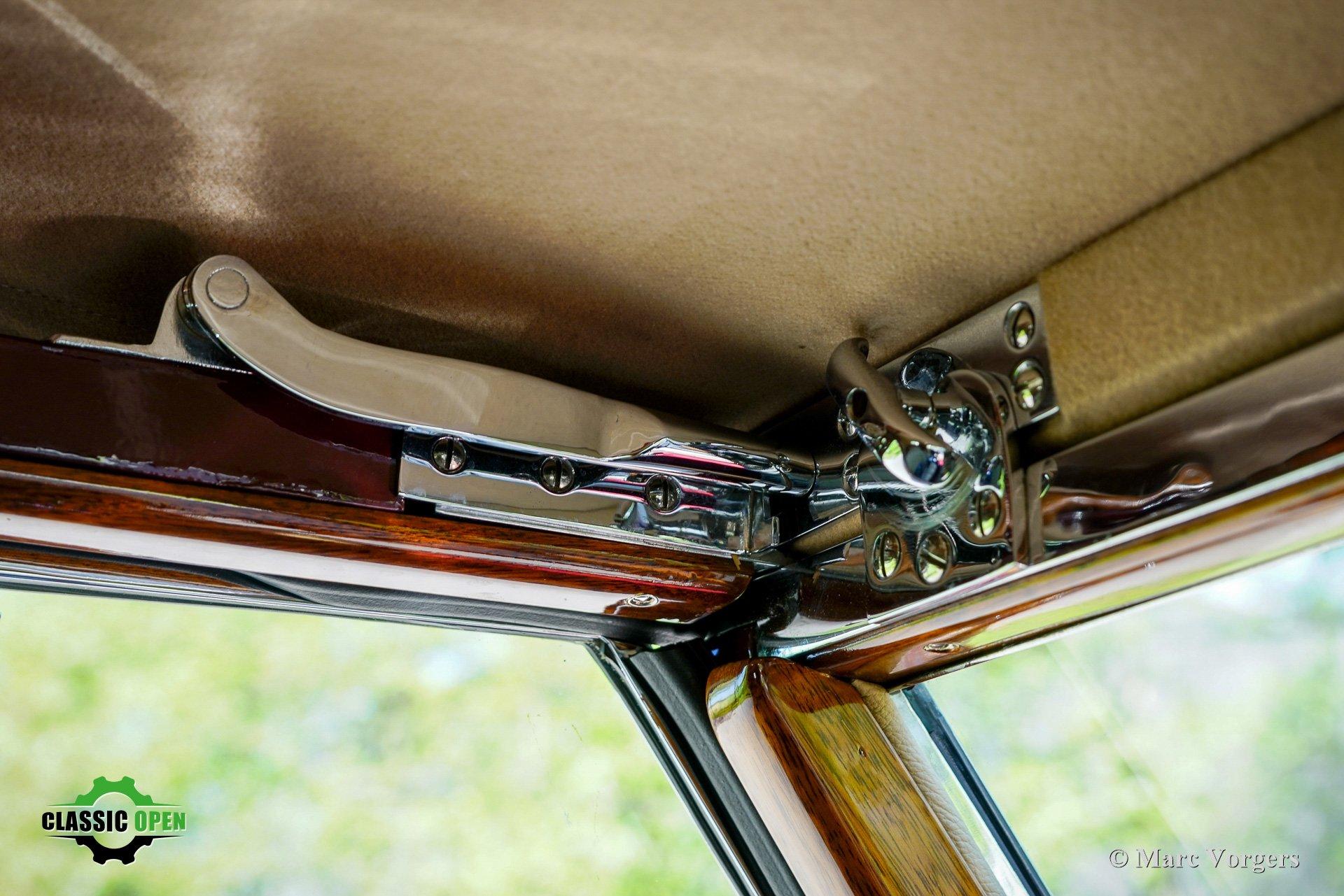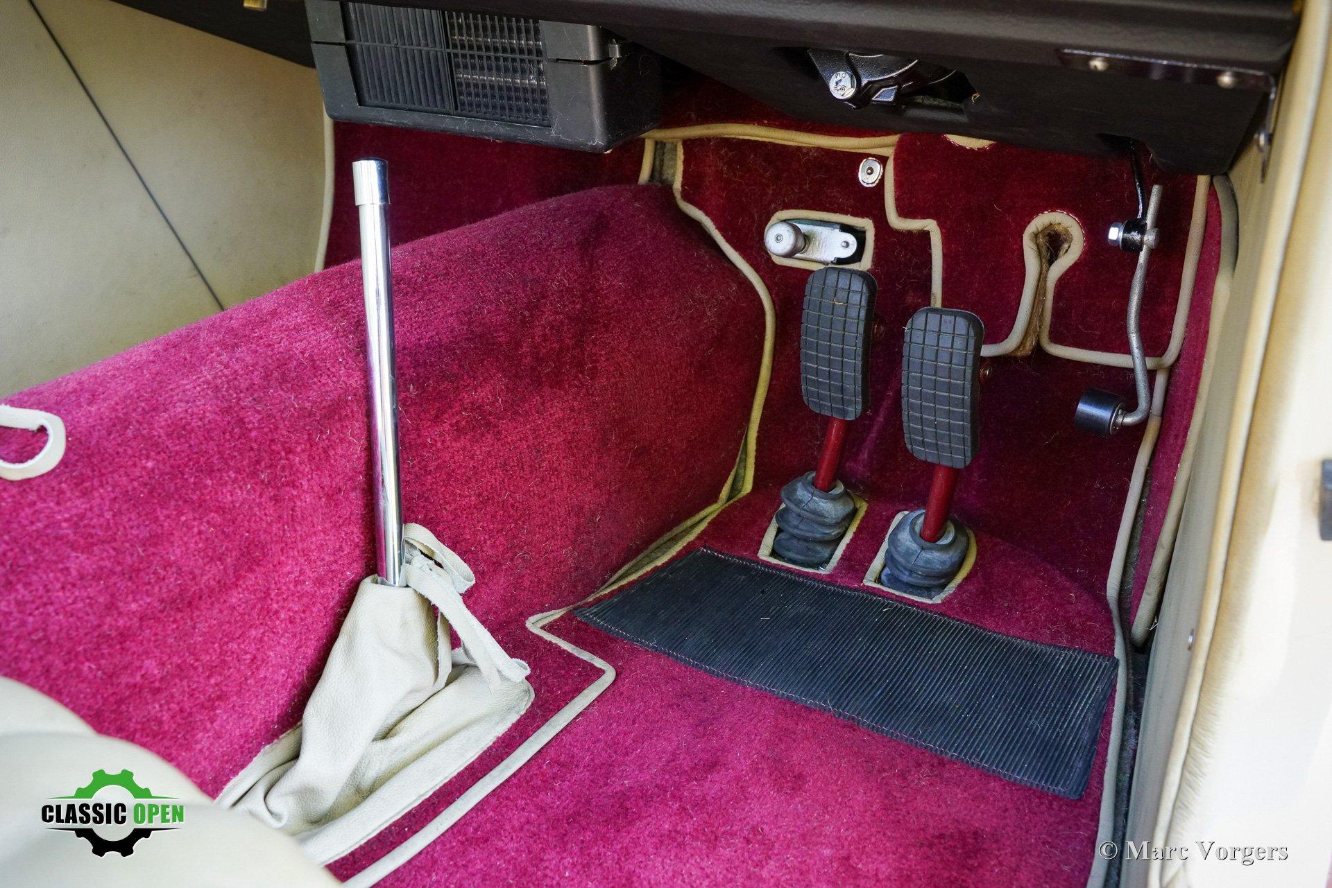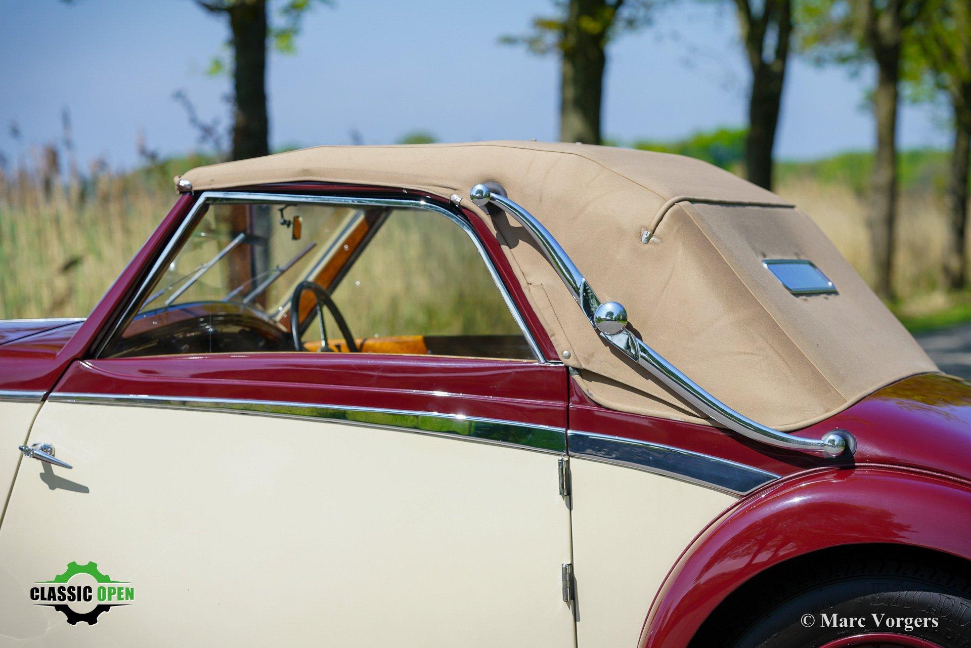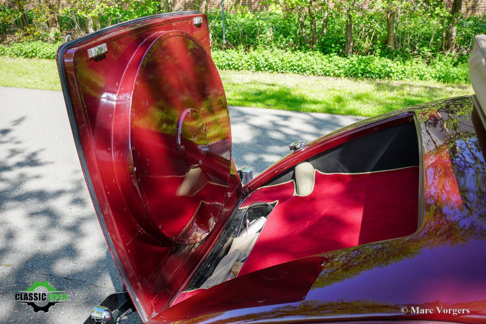 Exterieurkleur bordeauxrood boven crème wit gecombineerd met bordeauxrood gelakte spaakwielen en een beige mohair kap en kapafdekking.