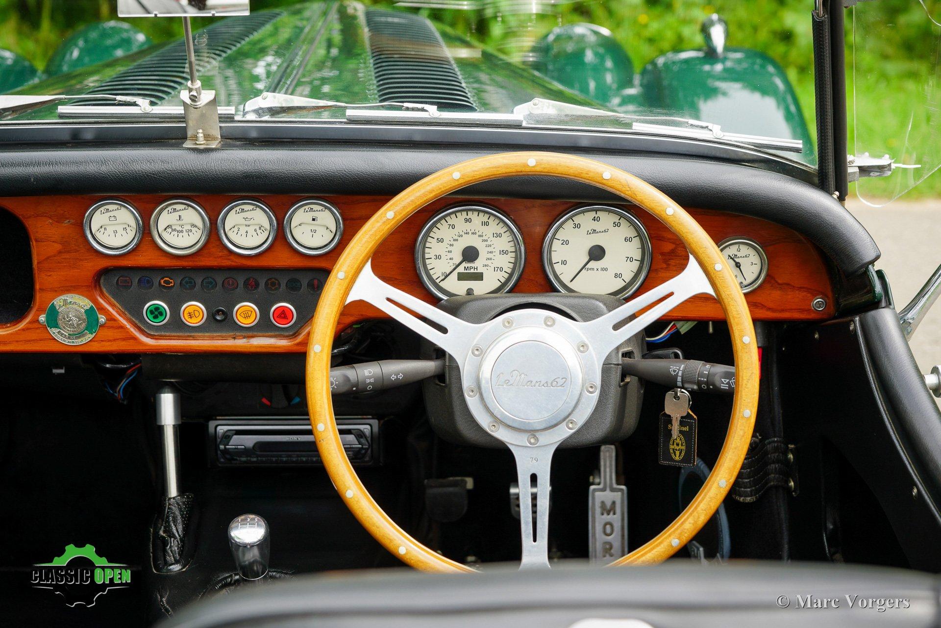 Ook de speciale uitlaat, de verlaagde rijhoogte en de korte versnellingspook zijn uniek voor deze Morgan 4/4.