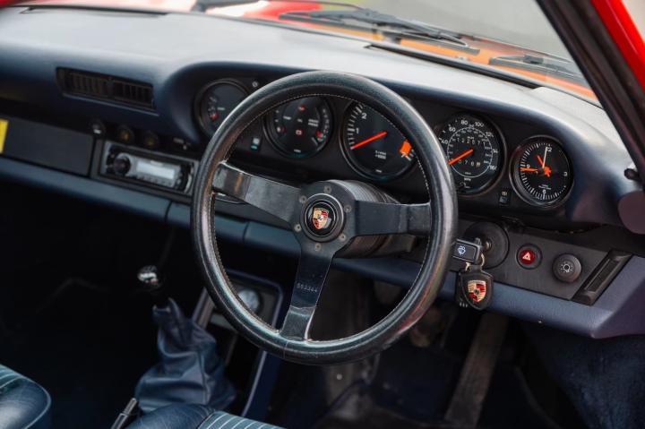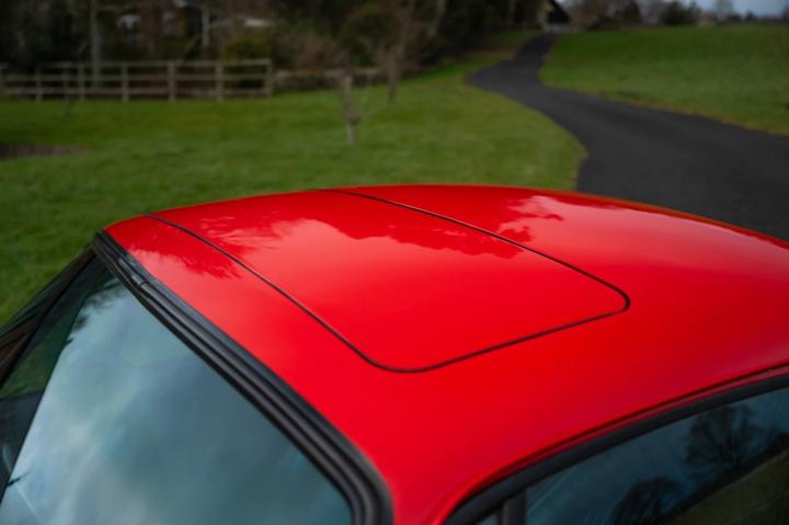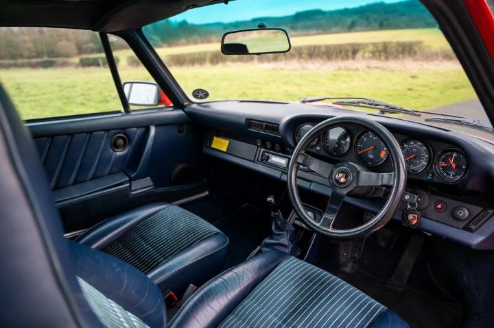 It is finished in Guards Red and has a blue half leather pinstripe interior.