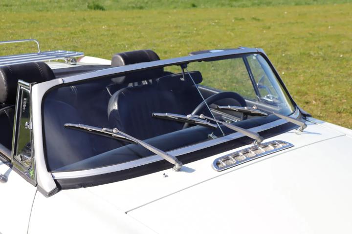 De carrosserie is zeer netjes en roest- en schadevrije. Het lakwerk springt in het oog en is opvallend fris. Ook de rubbers en de verlichting zijn gaaf. De spaakwielen beschikken over goede banden en aan de voorzijde geven rood gespoten remblokken de auto een sportieve touch. Leuke accessoires zijn het kofferrekje en de trekhaak. De originele chroombumpers zijn vrij van noemenswaardige beschadigingen. Ook de softtop verkeert in goede staat zonder scheuren of beschadigingen, en het sluitwerk functioneert goed.