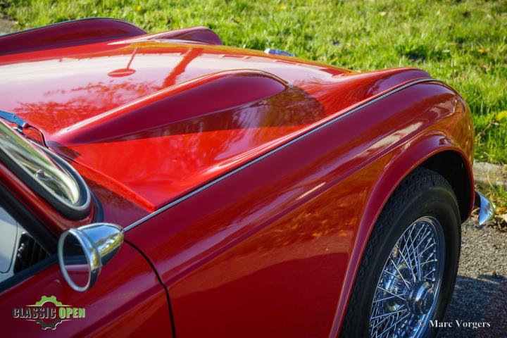 Kleur rood gecombineerd met een zwartlederen interieur afgewerkt met witte biezen en zwart tapijt. Deze prachtige Triumph TR 4 is uitgerust met een zeldzame originele ‘Surrey-top’. Hiervan heeft Porsche het ‘Targa’ dak afgekeken.