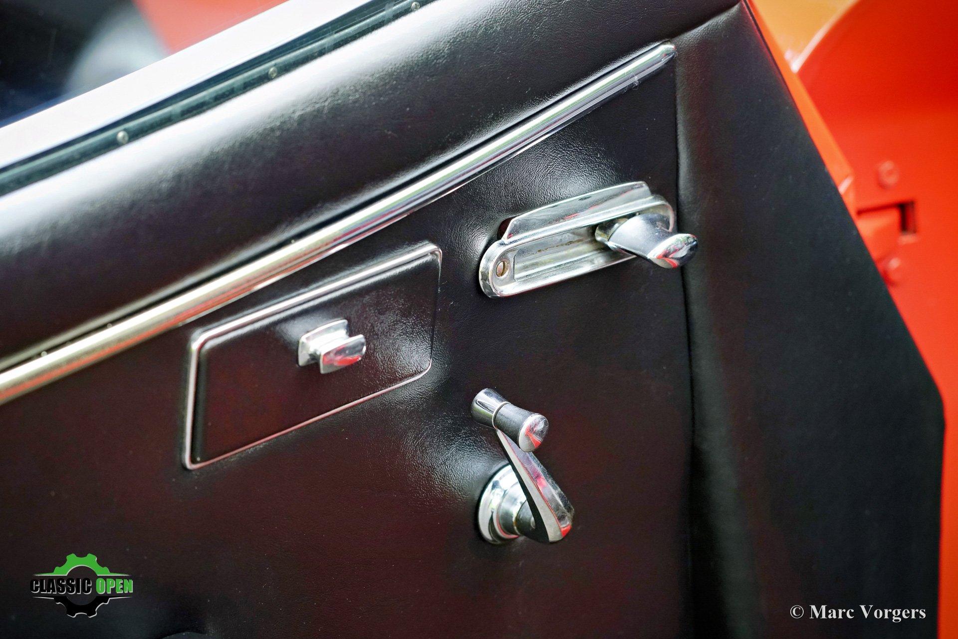 Kleur Carmen rood gecombineerd met een zwartlederen interieur afgewerkt met zwart tapijt. Zwarte soft top en tonneaucover.