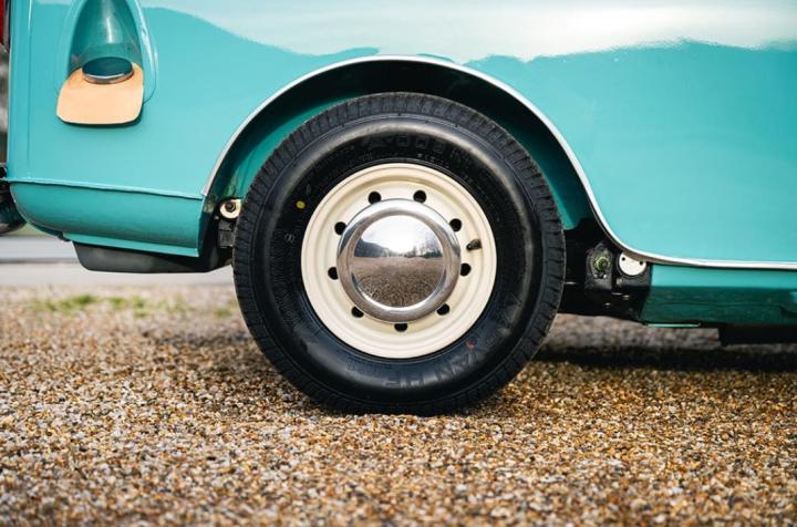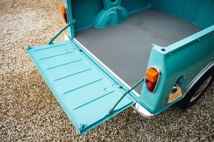Ce charmant Morris Mini Pick-Up de 1975, dans sa teinte Aquamarine, est dans une configuration absolument authentique.