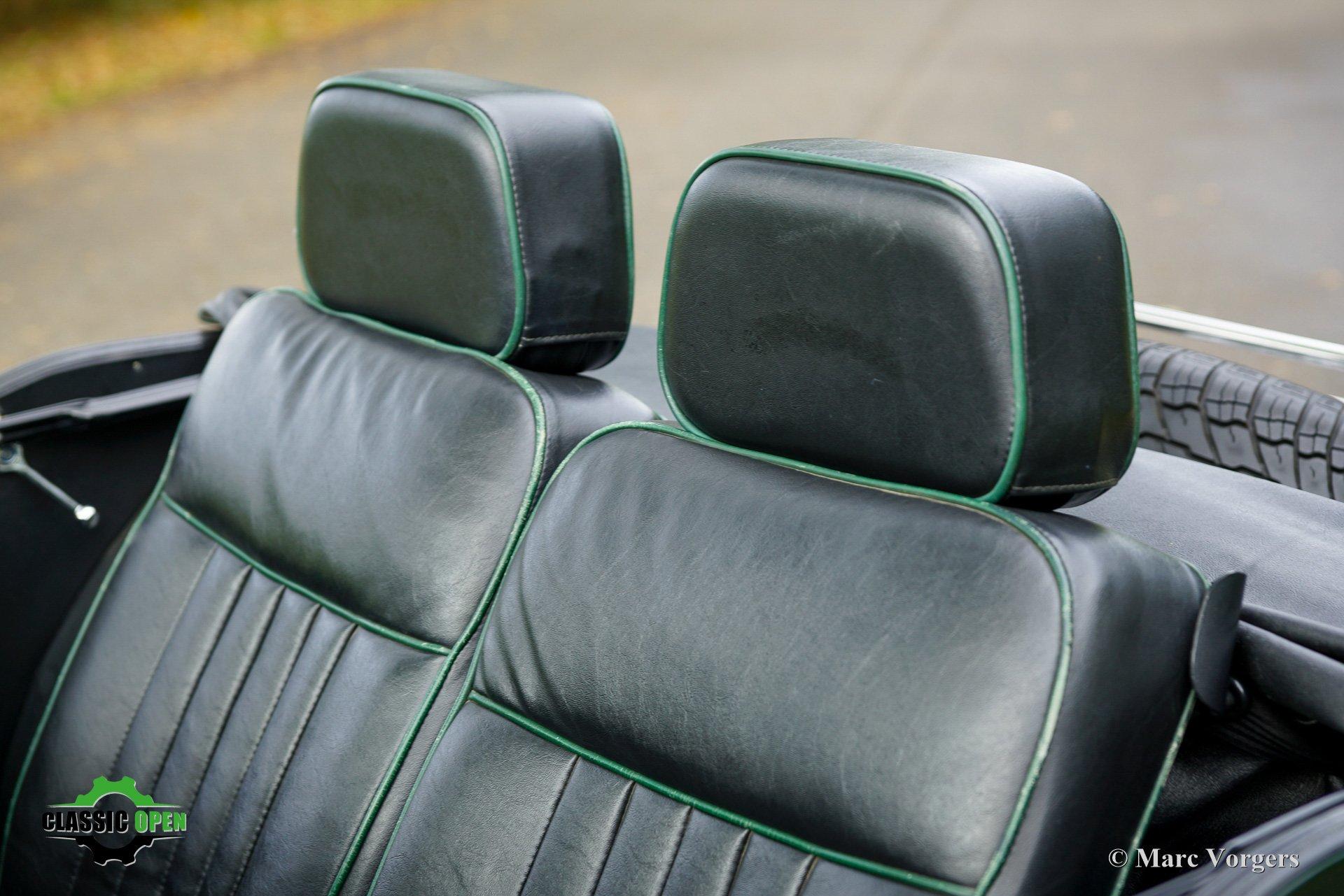 Carrosserie gelakt in British Racing Green, gecombineerd met een zwarte vinyl soft-top en tonneaucover. Zwartlederen interieur afgewerkt met groene biezen en zwart tapijt.