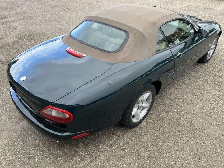 The body is straight and solid. It still wears its original British Racing Green paint, which retains a nice shine but shows age-appropriate wear and minor touch-ups. The right front fender and passenger door were repainted in the past. According to the VIN report there is no damage history, and the mileage has increased logically over time. The car currently shows 102.321 miles. The automatic convertible top mechanism works well, while the soft top itself shows typical wear on both the inside and outside after nearly three decades. All Jaguar emblems on the body and wheels have been removed and are missing.